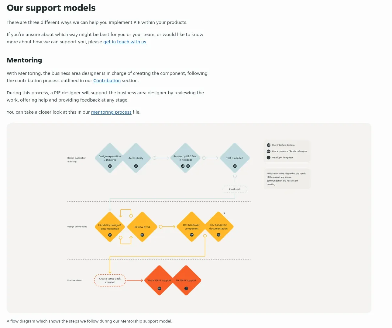 It also includes access to a dedicated support team with resources specifically made for designers. The design system calls out the support and shares the available support models, such as mentoring or help with cleanup.