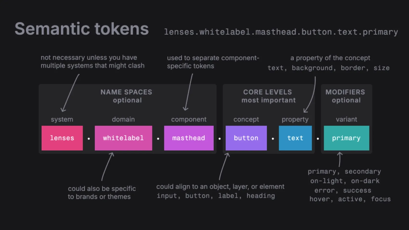 The key to success in naming your tokens hierarchy is a system that easily allows you to add more tokens without having to change your hierarchy!