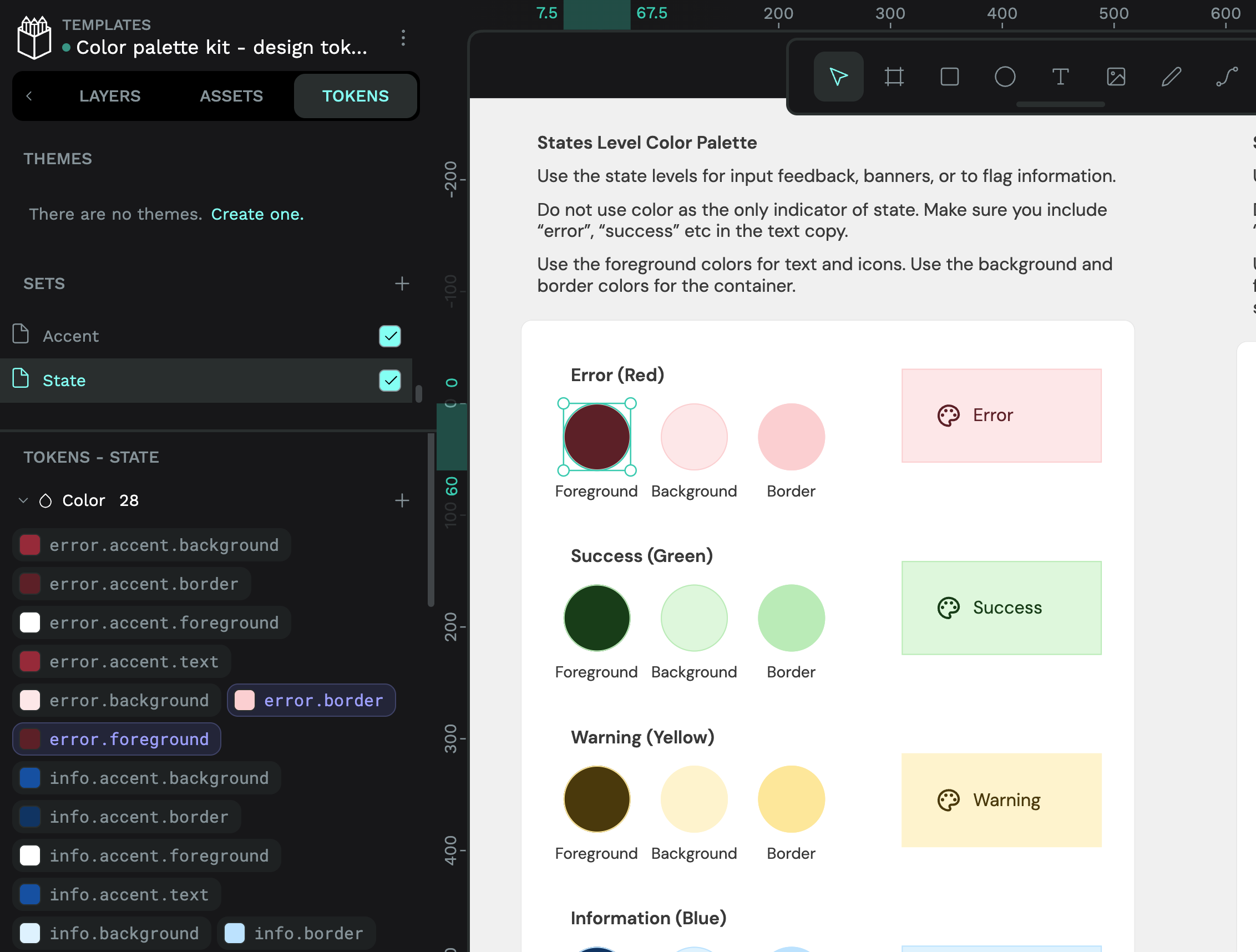 Key features and use cases: Every color token is demoed in the file. If you edit the token color, the demo will update accordingly. The swatches work well with the Color Contrast plugin if you want to check your color accessibility.