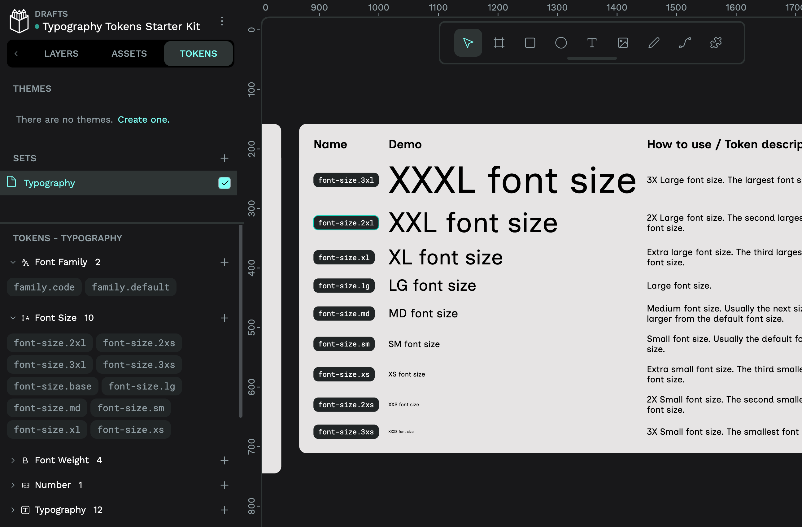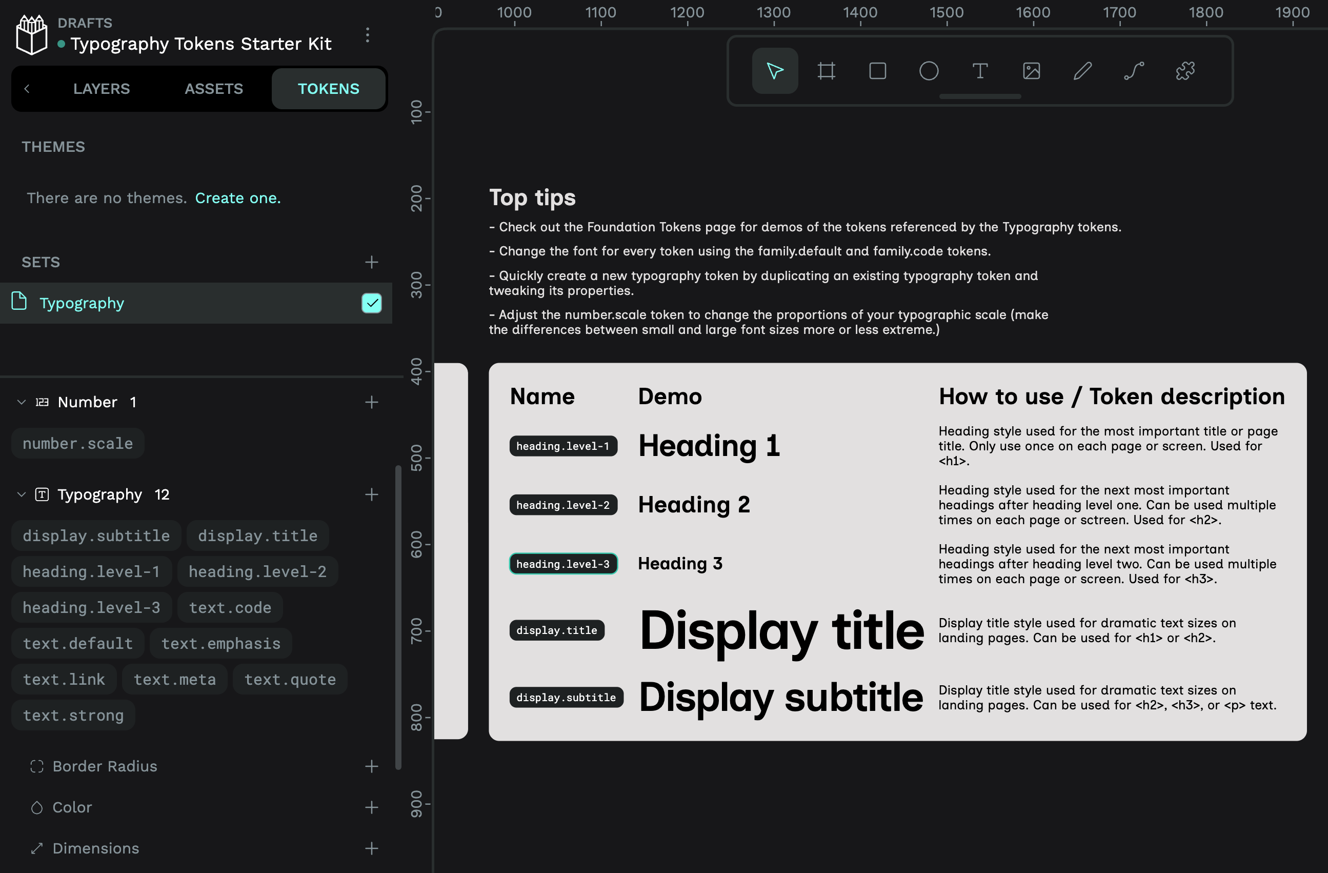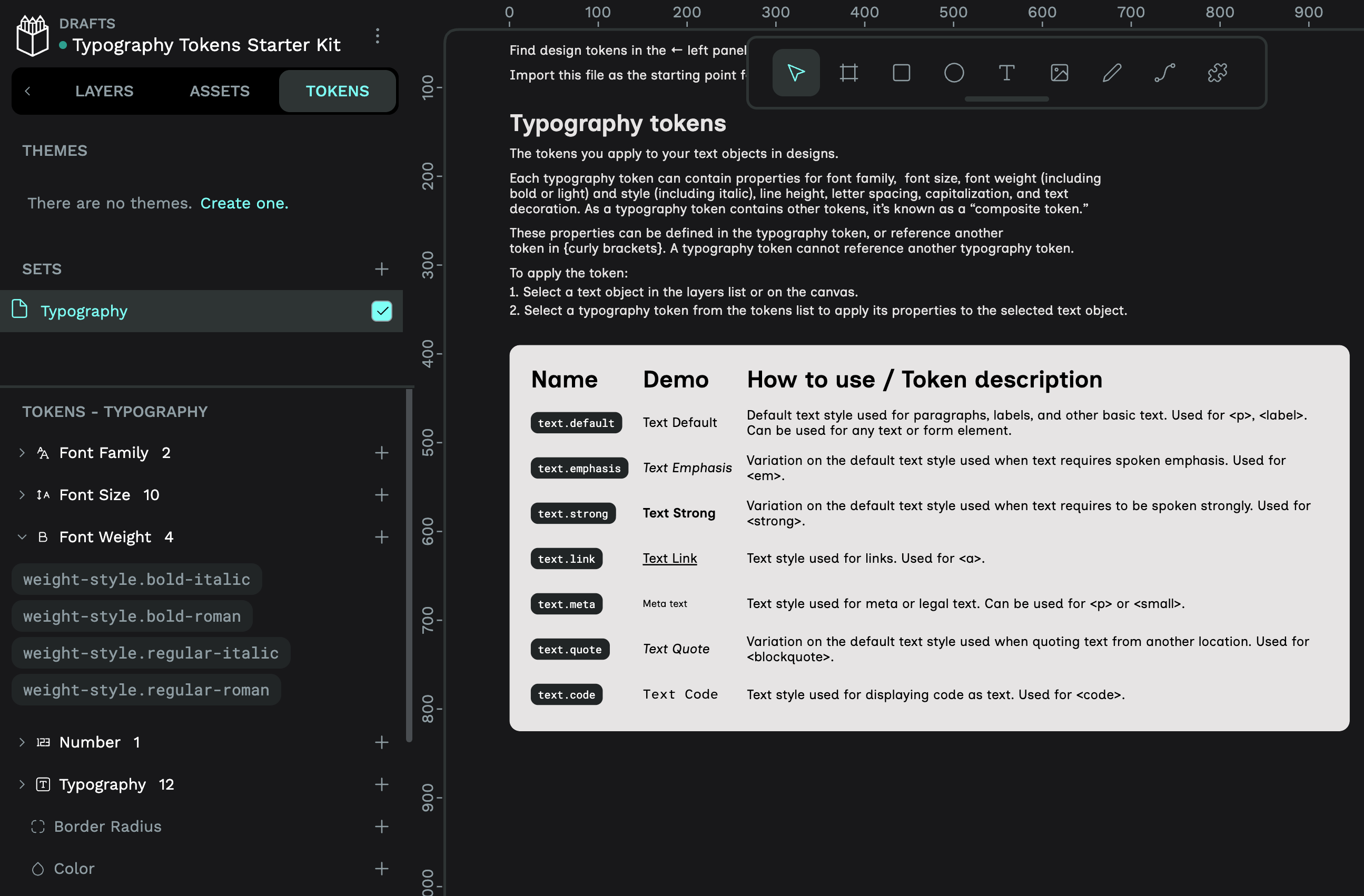 29 design tokens to help start your typographic system. Use the file to experiment with typography tokens, or export the tokens to use in your own design projects.