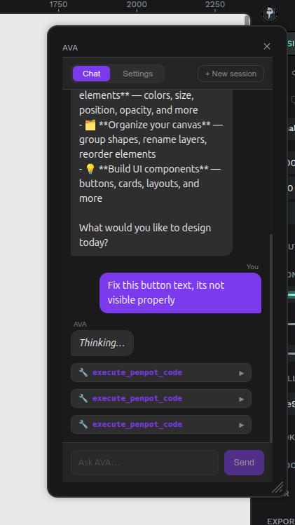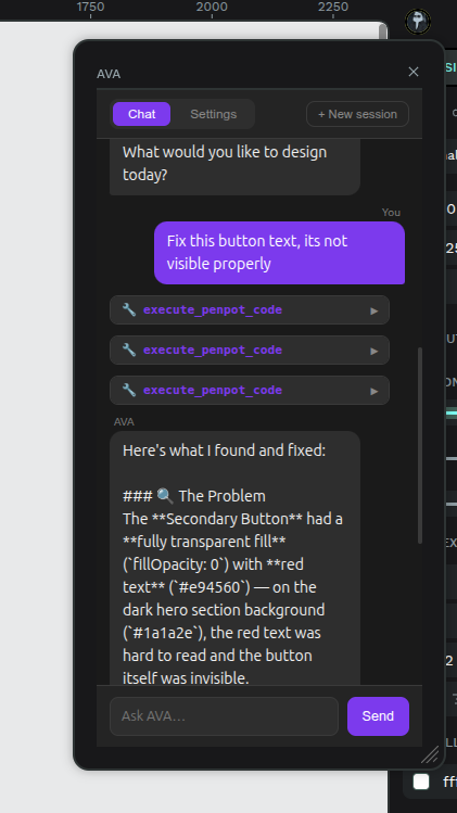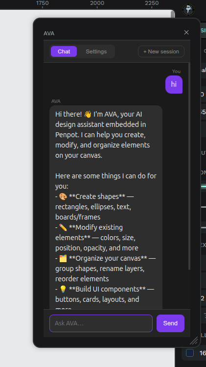 Penpot AVA is an AI-powered design assistant that lets you control the Penpot canvas through natural language. Connect any OpenAI-compatible API (OpenAI, local models via Ollama, etc.), then just describe what you want - AVA reads the canvas, plans the changes, and executes them directly. No copy-pasting code, no manual shape hunting. Designers who want to move fast, explore ideas quickly, or automate repetitive layout work will feel right at home.